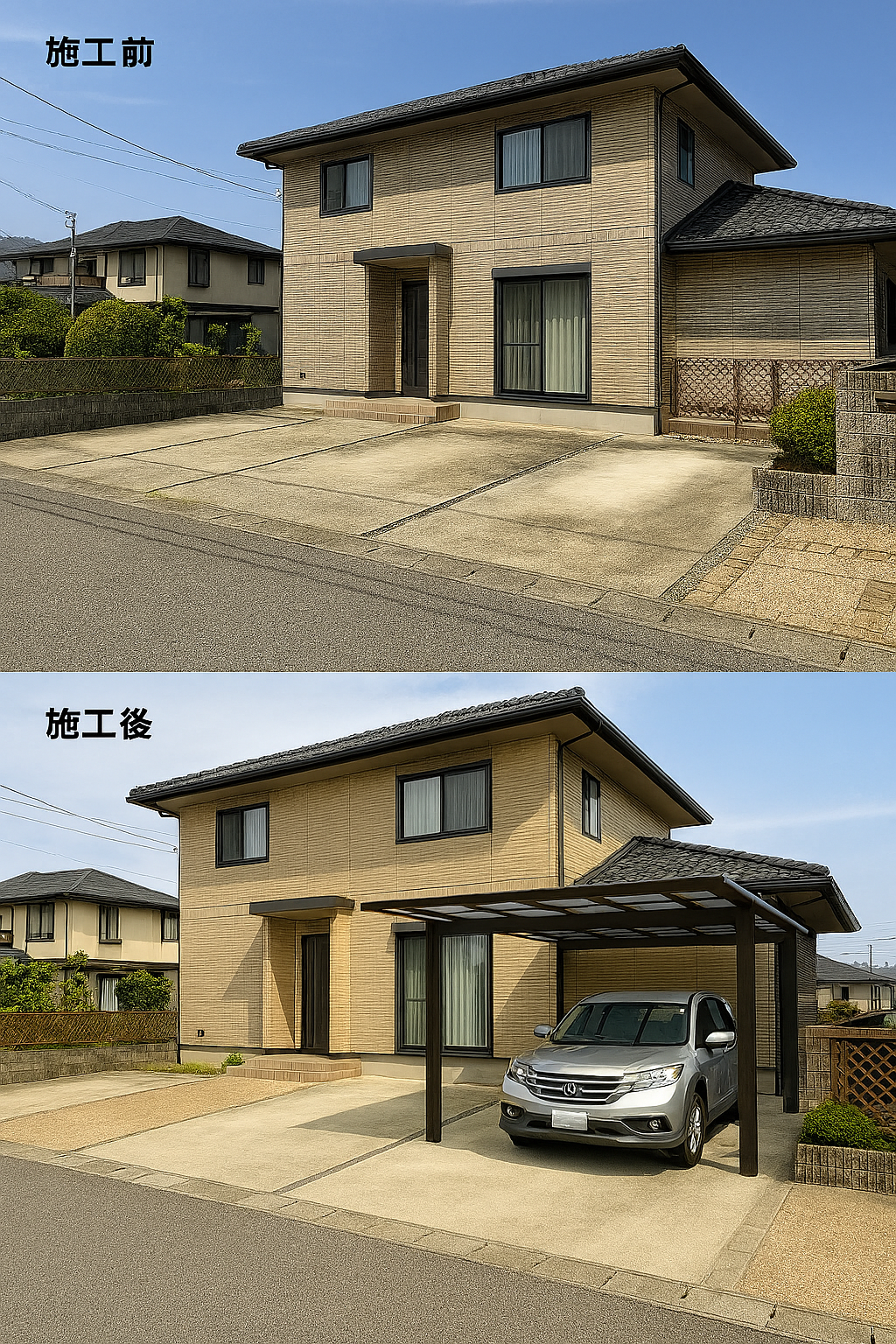 雨風や雪から愛車を守るため、カーポートを新設しました。施工前は屋根のない駐車スペースでしたが、設置後は天候に左右されず、乗降時も快適に。丈夫なフレームとすっきりとしたデザインで、住宅の外観にも自然に馴染みます。